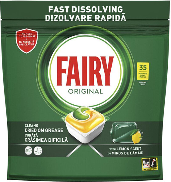 Οι κάψουλες πλυντηρίου πιάτων Fairy Original All in One προσφέρουν καθαριότητα με την πρώτη, ακόμη και στα ξεραμένα λίπη. Συνδυάζουν υγρό πιάτων και απορρυπαντικό σε σκόνη σε μία κάψουλα. Η εξαιρετικά διαλυτή μεμβράνη τους διασπάται ταχύτατα, ξεκινώντας άμεσα τον καθαρισμό. Και είναι απίστευτα εύκολες στη χρήση! Δεν χρειάζεται να αφαιρέσετε τη μεμβράνη, απλά τοποθετήστε τις στη θήκη του απορρυπαντικού.