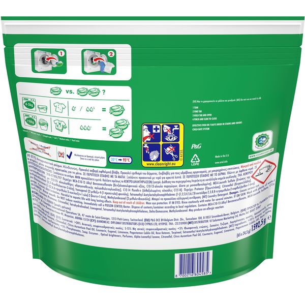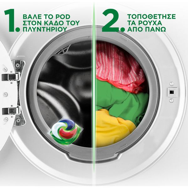 Οδηγίες χρήσης: Τοποθετήστε 1 κάψουλα στο πίσω μέρος του κάδου πριν τα ρούχα. Ιδανικό για καθημερινή φροντίδα, ακόμη και σε κρύες ή συντομες πλύσεις. Για ιδιαίτερα επίμονους λεκέδες, προσθέστε μια μικρή ποσότητα πλυντηριακού από πάνω χωρίς να τρίψετε.