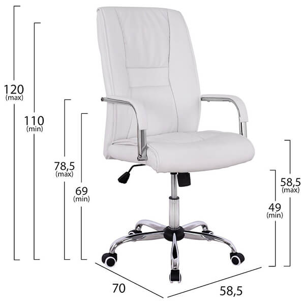 ΚΑΡΕΚΛΑ ΓΡΑΦΕΙΟΥ ANGEE HM1106.02 ΣΕ ΧΡΩΜΑ ΛΕΥΚΟ PER.819606 PER.819606 HM HM OFFICE CHAIRS Κατηγορία: OFFICE CHAIRS •HM στην κατηγορία OFFICE CHAIRS Καρέκλα γραφείου διευθυντική με μπράτσα και ανάκλιση από υψηλής ποιότητας PU σε λευκό χρώμα και μοναδικό design.-Μπράτσα και βάση μεταλλικά ενισχυμένα βαρέως τύπου επιχρωμιωμένα. -Ροδάκια ενισχυμένα. -Κάθισμα και πλάτη ανατομικά με διπλά μαξιλαράκια στήριξης.br>-Ιδανική για αυτούς που κάθονται αρκετές ώρες μπροστά στον υπολογιστή. Χαρακτηριστικά: • Διαστάσεις: 58.5 x 70 x 110-120 εκ.• Ύψος καθίσματος: 49 εκ./58.5 εκ.• Ύψος μπράτσων: 69 εκ./78.5 εκ.• Διαστάσεις καθίσματος: 50 x 50 εκ.• Χρώμα: Λευκό.• Εγγύηση: 1 χρόνος. DOA 7 ημερών
