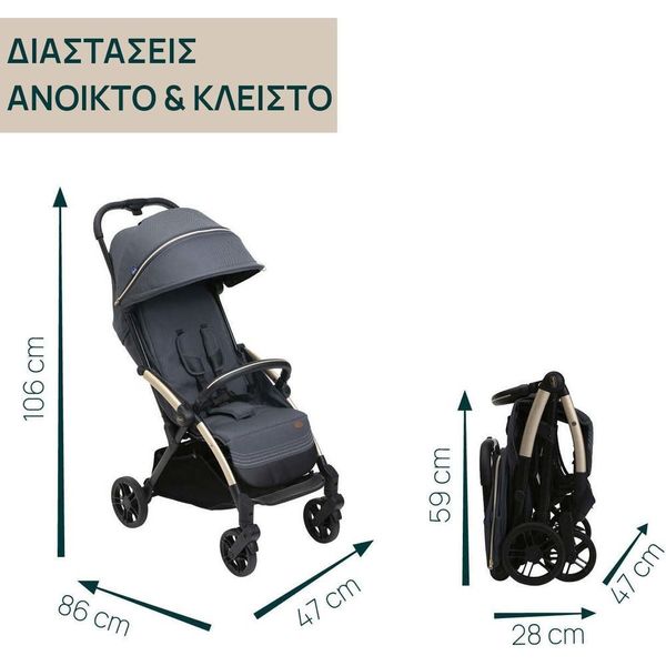 Chicco Καρότσι Μωρού Goody Xplus Dark Shadow για Παιδί έως 22kg Goody XPlus, το καρότσι με αυτόματο κλείσιμο της Chicco για να κερδίσετε κάθε δρόμο! Το καρότσι Goody XPlus συνδυάζει την τεχνολογία αυτόματου κλεισίματος OneTouch με την κομψότητα, δίνοντας στους γονείς ένα καρότσι φτιαγμένο για να ξεχωρίζει τόσο για την εξυπνάδα όσο και για το στυλ του. Εγκεκριμένο από τη γέννηση έως 22 κιλά (περίπου 4 ετών). - Μεγάλοι τροχοί υψηλής απόδοσης: αμορτισέρ και ρουλεμάν σε όλους τους τροχούς για μια πραγματικά ομαλή και άνετη οδήγηση σε κάθε επιφάνεια. - Εξαιρετική ευκολία χρήσης χάρη στα ρουλεμάν που βρίσκονται και στο σύστημα περιστροφής. - Χρωματιστός ανοδιωμένος σκελετός, ποιοτικά μαλακά υφάσματα και premium ραφές για απόλυτη κομψότητα. - Φαρδύ και φιλόξενο κάθισμα με επένδυση για μέγιστη άνεση. - Μεγάλη και πλήρως εξοπλισμένη κουκούλα για να ικανοποιήσει κάθε ανάγκη: είναι επεκτάσιμη και στο πάνω μέρος διαθέτει ένα παράθυρο με δίχτυ για να διατηρεί ο γονιός την οπτική επαφή με το παιδί. - Χάρη στην επεξεργασία αδιαβροχοποίησης και UV50+ κάνει το καρότσι Goody XPlus κατάλληλο για κάθε εποχή. Διαστάσεις Ανοιχτό: 106 x 86 x 47 cm Διαστάσεις Κλειστό: 59 x 28 x 47 cm Βάρος: 7,5 kg Πριν την χρήση, παρακαλούμε να διαβάσετε με προσοχή στην συσκευασία τις οδηγίες χρήσης και προειδοποιήσεις. - Περιλαμβάνεται στο πακέτο κουκούλα βροχής.