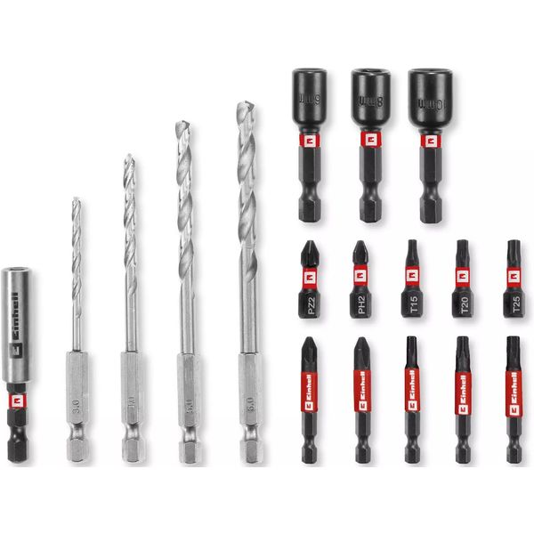 Περιεχόμενα συσκευασίας: 5 bits 25 mm, 5 bits 50 mm, 3 καρυδάκια (6 / 8 / 10 mm), 4 τρυπάνια μετάλλου HSS, 1 αντάπτορας bits 60 mm, κασετίνα αποθήκευσης