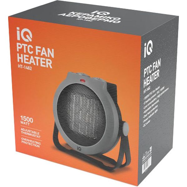 Κεραμικό αερόθερμο IQ HT-1462 με ισχύ 750/1500W, γρήγορη θέρμανση, ρυθμιζόμενο θερμοστάτη και προστασία υπερθέρμανσης. Ιδανικό για αποδοτική και οικονομική θέρμανση μικρών χώρων.