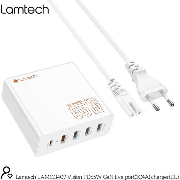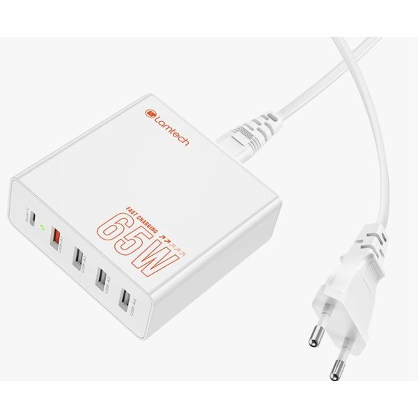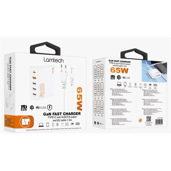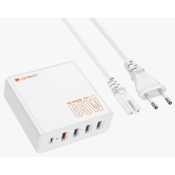 Ο LAMTECH GaN Fast Charger 65W είναι ένας πολυλειτουργικός ταχυφορτιστής υψηλής απόδοσης, σχεδιασμένος για ασφαλή, σταθερή και γρήγορη φόρτιση πολλαπλών συσκευών. Διαθέτει 1 θύρα Type-C και 4 θύρες USB-A με υποστήριξη Quick Charge 3.0, καλύπτοντας πλήρως τις ανάγκες σύγχρονων χρηστών.
