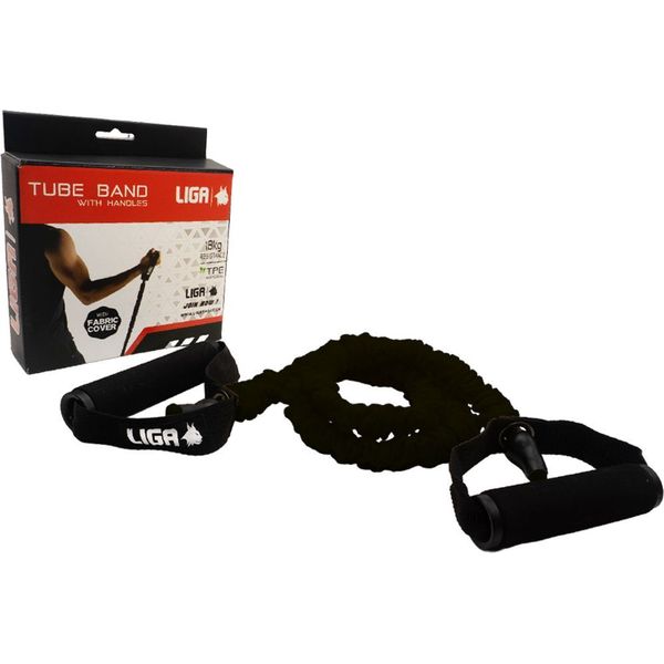 Λάστιχο αντίστασης με λαβές από την Liga Sport. Το λάστιχο είναι κατασκευασμένο από θερμοπλαστικό ελαστομερές (TPE) και καλυμμένο με ύφασμα που προσφέρει προστασία από υπερέκταση και μικροφθορές. Το επίπεδο αντίστασης είναι 18 kg (μεσαίο προς σκληρό) για αθλητές και αθλήτριες που θέλουν να ενισχύσουν την προπόνησή τους και να ενδυναμώσουν το μυικό τους σύτημα.