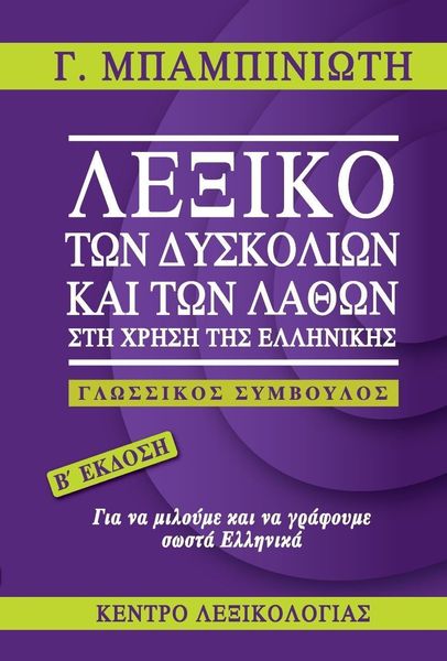 ISBN: 978-960-9582-19-3 Συγγραφέας: ΜΠΑΜΠΙΝΙΩΤΗΣ ΓΕΩΡΓΙΟΣ Εκδοτικός οίκος: ΚΕΝΤΡΟ ΛΕΞΙΚΟΛΟΓΙΑΣ Σελίδες: 1114 Διαστάσεις: 13Χ19,5 Ημερομηνία Έκδοσης: Ιούνιος 2022 ΓΙΑ ΝΑ ΜΙΛΑΜΕ ΚΑΙ ΝΑ ΓΡΑΦΟΥΜΕ ΣΩΣΤΑ ΕΛΛΗΝΙΚΑ Το παρόν Λεξικό λειτουργεί ως «γλωσσικός σύμβουλος» κάθε ομιλητή τής ελληνικής γλώσσας, παρέχοντας έγκυρες και κατανοητές συμβουλές για κάθε γλωσσική δυσκολία που συναντά (ορθογραφική, σημασιολογική, γραμματική, συντακτική, υφολογική) 5.500 λήμματα-σχόλια σχετικά με: ΣΥΝΗΘΗ ΛΑΘΗ στη χρήση της γλώσσαςΔΥΣΚΟΛΙΕΣ στην επιλογή τής κατάλληλης λέξης, τύπου ή σύνταξηςΑΠΟΡΙΕΣ για τις διαφορές σημασίας λέξεων που συγχέονταιΣΥΜΒΟΥΛΕΣ για ορθές γλωσσικές επιλογές Χαρακτηριστικά τού Λεξικού Δυσκολιών και Λαθών: τα λάθη και οι δυσκολίες δίδονται ως λήμματα για ευκολότερη αναζήτησησε εκτενή συνθετικά σχόλια αναλύονται γλωσσικά φαινόμενα που προκαλούν δυσκολία στον ομιλητή στα σχόλια αυτά παραπέμπονται και όλες οι λέξεις ή χαρακτηριστικά παραδείγματα λέξεων με ανάλογες δυσκολίες αξιοποιούνται με εύληπτο τρόπο τα πορίσματα τής σύγχρονης γλωσσικής επιστήμης, ώστε να αντιμετωπίζονται οι γλωσσικές δυσκολίες και να γίνονται κατανοητά τα γραμματικά και συντακτικά φαινόμενα παρέχεται πλήθος παραδειγμάτων, εποπτικών πινάκων και συστηματικών παραπομπών