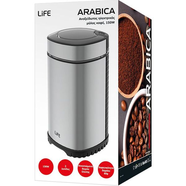 LIFE στην κατηγορία ΜΥΛΟΙ ΚΟΠΗΣ Ο ηλεκτρικός μύλος άλεσης καφέ LIFE ARABICA 150W είναι η ιδανική επιλογή για όσους απολαμβάνουν την αυθεντική γεύση του φρεσκοαλεσμένου καφέ. Με ισχυρό μοτέρ 150W και αποσπώμενο ανοξείδωτο δοχείο άλεσης, εξασφαλίζει ομοιόμορφη και αποτελεσματική άλεση κόκκων καφέ, ξηρών καρπών, καρυκευμάτων και βοτάνων.