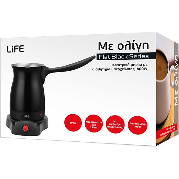 Το ηλεκτρικό μπρίκι LIFE "Με Ολίγη" της σειράς Flat Black συνδυάζει κομψό design και πρακτικότητα, προσφέροντας εύκολη και γρήγορη παρασκευή ελληνικού καφέ. Με ισχύ 800W και αισθητήρα υπερχείλισης, εξασφαλίζει ασφαλή και άνετη χρήση. Η αποσπώμενη κανάτα με ελεύθερη περιστροφή 360° διευκολύνει το σερβίρισμα, ενώ το cool touch χερούλι προσφέρει ασφαλή λαβή. Το ανοξείδωτο σώμα και η εσωτερική βάση διασφαλίζουν αντοχή και υγιεινή, ενώ το κρυφό θερμαντικό στοιχείο αποτρέπει τη δημιουργία αλάτων. Διαθέτει διακόπτη ON/OFF με φωτεινή ένδειξη λειτουργίας, καθώς και προστασία υπερθέρμανσης για επιπλέον ασφάλεια. Ιδανικό για την προετοιμασία ελληνικού καφέ με πλούσιο καϊμάκι, αλλά και για ζέσταμα νερού για τσάι και ροφήματα.