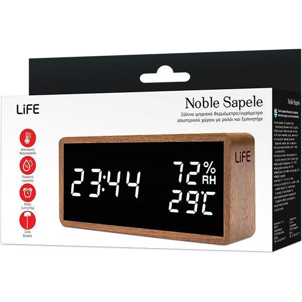 Το LIFE NOBLE Sapele είναι ένα κομψό ξύλινο ψηφιακό θερμόμετρο/υγρόμετρο εσωτερικού χώρου με ρολόι, ξυπνητήρι και ημερολόγιο, ιδανικό για κάθε δωμάτιο του σπιτιού ή το κομοδίνο σας. Με μεγάλες λευκές LED ενδείξεις, σας παρέχει πλήρη ενημέρωση για την ώρα, την ημερομηνία, τη θερμοκρασία και τα επίπεδα υγρασίας. Μπορείτε να προγραμματίσετε έως και 3 διαφορετικές αφυπνίσεις, ενώ οι λειτουργίες sleep display και save mode προσαρμόζουν έξυπνα τη φωτεινότητα ή απενεργοποιούν την οθόνη για εξοικονόμηση ενέργειας. Η τροφοδοσία γίνεται μέσω USB καλωδίου (περιλαμβάνεται) ή με μπαταρίες για μεγαλύτερη ευελιξία.