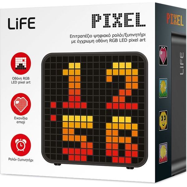 Το επιτραπέζιο ψηφιακό ρολόι/ξυπνητήρι LiFE PIXEL φέρνει χρώμα και μοναδικό χαρακτήρα στον χώρο σας, συνδυάζοντας πρακτικότητα και δημιουργικό design. Η RGB LED pixel art οθόνη προσφέρει εντυπωσιακά σχέδια και animations, μετατρέποντας ένα απλό ρολόι σε διακοσμητικό στοιχείο που προσαρμόζεται στη διάθεσή σας. Διαθέτει μεγάλη ποικιλία επιλογών, όπως εορταστικά animations, emoji εκφράσεις, στατικές εικόνες και δυναμικά εφέ φωτισμού, ενώ μπορείτε να επιλέξετε ανάμεσα σε διαφορετικά σχέδια ρολογιού. Η ρύθμιση φωτεινότητας σε 10 επίπεδα εξασφαλίζει άνετη προβολή σε κάθε συνθήκη, ημέρα ή νύχτα. Επιπλέον, προσφέρει λειτουργία αφύπνισης με snooze για λίγα λεπτά παραπάνω ξεκούρασης, καθώς και λειτουργία αντίστροφης μέτρησης με ηχητική ειδοποίηση. Η τροφοδοσία μέσω USB και η εφεδρική μπαταρία εξασφαλίζουν αξιόπιστη λειτουργία σε κάθε στιγμή. - Τύπος: ψηφιακό ρολόι/ξυπνητήρι