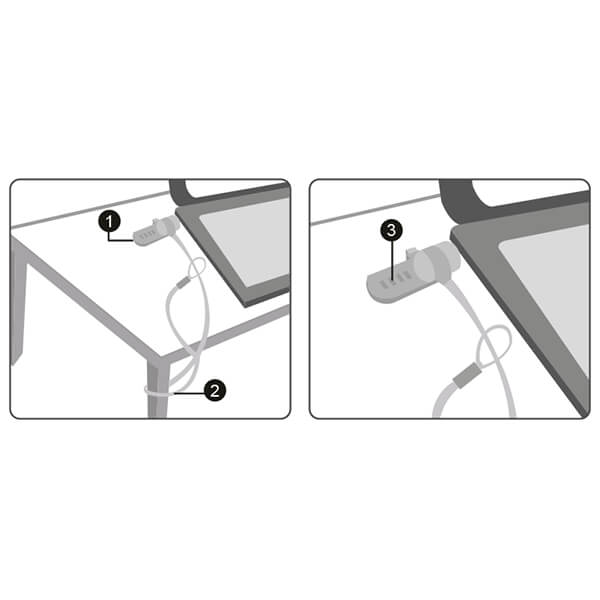 Κλειδαριά φορητού υπολογιστή με συνδυασμό τεσσάρων ψηφίων. Έχει ισχυρό καλώδιο με προστατευτική επικάλυψη από PVC που εγγυάται προστασία από κλοπή.