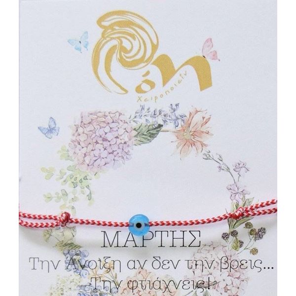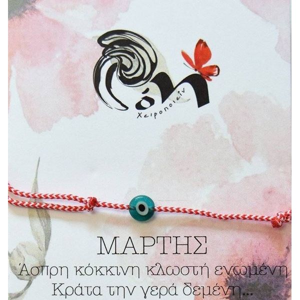Χειροποίητο βραχιόλι Μάρτη, με πλεκτό μοτίβο σε λευκό και κόκκινο χρώμα. Ιδανικό για άντρες και γυναίκες. Το μέγεθος αυξομειώνει. Από τη 1η έως τις 31 Μάρτη, συνηθίζεται να φοριέται στον καρπό του χεριού ένα βραχιολάκι, φτιαγμένο από στριμμένη άσπρη και κόκκινη κλωστή, τον "Μάρτη" ή "Μαρτιά"... ...Σύμφωνα με τη λαϊκή παράδοση, ο "Μάρτης" φοριέται κυρίως για να προστατεύει τα πρόσωπα για να μην καούν από τον πρώτο ήλιο της Ανοιξης. Ο "Μάρτης" φτιάχνεται την τελευταία ημέρα του Φεβρουαρίου και φοριέται είτε σαν δαχτυλίδι στα δάχτυλα, είτε στον καρπό του χεριού σαν βραχιόλι. "Μάρτη" δεν φορούσαν μόνο οι άνθρωποι. Σε κάποιες περιοχές της χώρας κρεμούσαν την κλωστή όλη τη νύχτα στα κλαδιά μιας τριανταφυλλιάς για να χαρίσουν ανθοφορία, ενώ σε άλλες περιοχές την έβαζαν γύρω από τις στάμνες για να προστατέψουν το νερό από τον ήλιο και να το διατηρήσουν κρύο. Χρώμα>’σπρο,κόκκινο κορδόνι Τα προϊόντα των κατηγοριών Αθλητικά, Βρεφικά - Παιδικά, Ενδυση Υπόδηση πωλούνται από την εταιρεία Electronic Shopping Greece ΑΕ σε συνεργασία με το site Plus4u.gr. Η υποστήριξη μετά την πώληση και οι εγγυήσεις των προϊόντων αυτών παρέχονται από την ίδια εταιρεία μέσα από το site www.plus4u.gr και το τηλεφωνικό κέντρο 211 2000 700. Μπορείτε να συνδυάσετε τα προϊόντα αυτά με τα υπόλοιπα προϊόντα του e-shop.gr και να τα παραλάβετε μαζί ώστε να μειώσετε τα έξοδα αποστολής. Μπορείτε επίσης να παραλάβετε από οποιοδήποτε eshop point με μηδενικά έξοδα αποστολής ανεξαρτήτως ύψους παραγγελίας!
