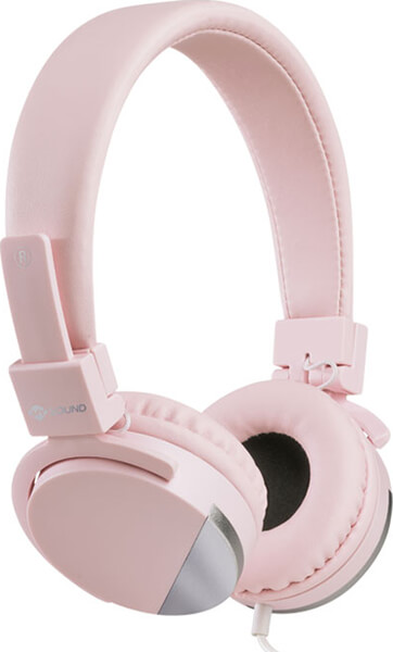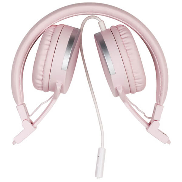 Στερεοφωνικά ακουστικά με μικρόφωνο, σε ροζ χρώμα και συμπαγές μέγεθος.