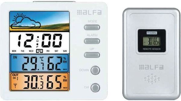 - Ενδείξεις: ώρα, ημερομηνία, ημέρα, εσωτερική/εξωτερική θερμοκρασία, εσωτερική/εξωτερική υγρασία