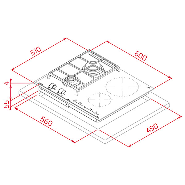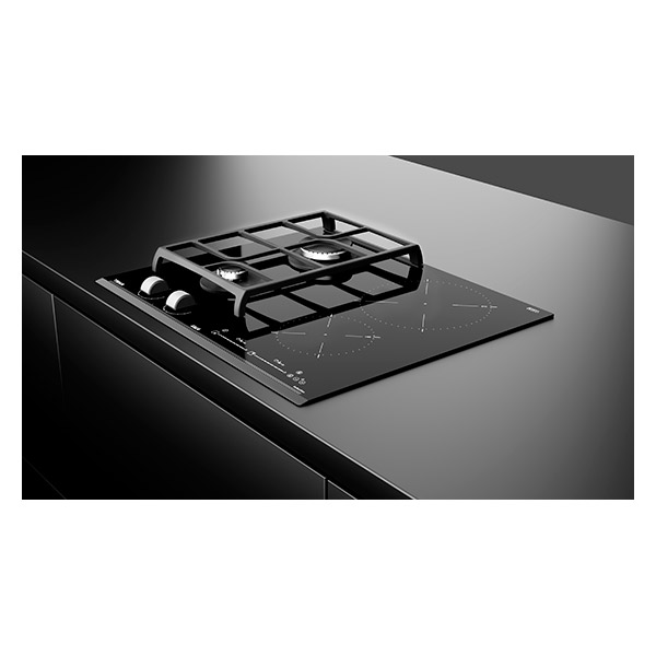 - 4 ζώνες μαγειρέματος: 1 επαγωγή 210 Φ (2250-3000 W), 1 επαγωγή 145 Φ (1250-1800 W), 1 ταχείας αερίου (2, 8 kW), 1 βοηθητική αερίου (1, 0 kW) .