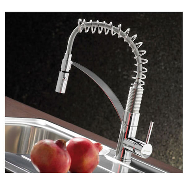 -Διαθέτει σπιράλ, για να καθαρίζετε εύκολα κατσαρόλες και ταψιά, αλλά εξασφαλίζει και την πλήρη κάλυψη του νεροχύτη. Η επαναφορά του ελατηρίου είναι αφενός αυτόματη και αφετέρου δεν χρειάζεται να έχετε κενό χώρο στο ντουλάπι κάτω από τον νεροχύτη.