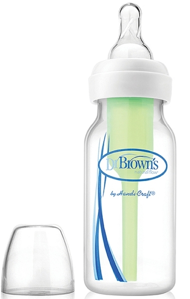 Το μπιμπερό περιέχει σύστημα φυσικής ροής, βουρτσάκι και θηλή επιπέδου 1 από διάφανη σιλικόνη.