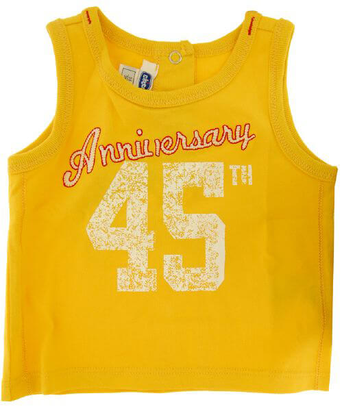 Αμάνικο μπλουζάκι σε κίτρινο χρώμα. Διαθέτει μπροστά μια εκτύπωση ««45TH ANNIVERSARY» εξαιρετικής ποιότητας. Κλείνει στην πλάτη με τρουκς για μεγαλύτερη ευκολία.
