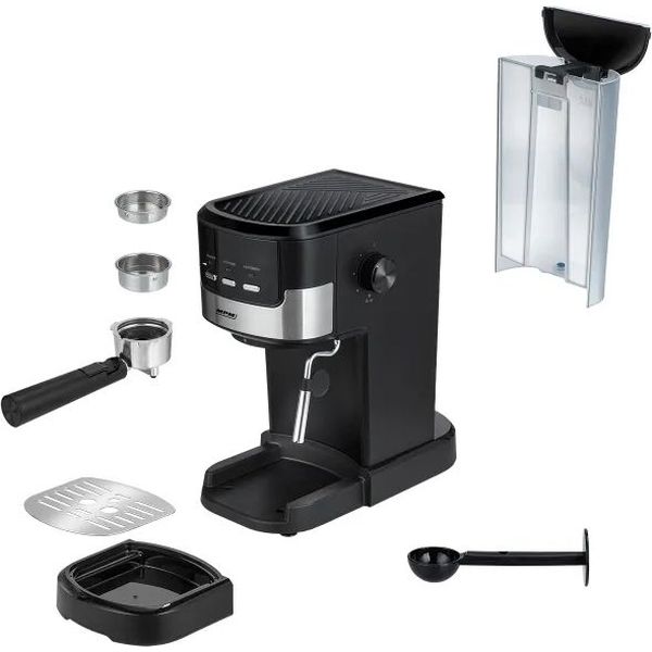 Διαθέτει αποσπώμενο δοχείο νερού χωρητικότητας 1,2 λίτρων, που επιτρέπει την παρασκευή πολλών καφέδων χωρίς συχνό γέμισμα και διευκολύνει τον καθαρισμό. Η ομαλή ρύθμιση της παραγωγής ατμού προσφέρει ακρίβεια στον έλεγχο της έντασης, επιτρέποντας προσαρμογή ανάλογα με το είδος του ροφήματος. Το ενσωματωμένο ακροφύσιο αφρόγαλα επιτρέπει τη δημιουργία πλούσιου και αφράτου αφρού, ιδανικού για cappuccino και latte. Η ισχύς των 1100W συμβάλλει στη γρήγορη προθέρμανση και στην αποδοτική λειτουργία της συσκευής, προσφέροντας σταθερή απόδοση στην καθημερινή χρήση. Χαρακτηριστικά: