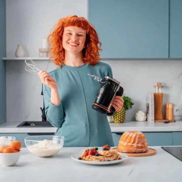 Περιλαμβάνονται αναδευτήρες για χτύπημα αυγών, ελαφριών κρεμών και σαλτσών, καθώς και άγκιστρα για ζύμωμα, κατασκευασμένα από ανθεκτικά υλικά και κατάλληλα για πλύσιμο στο πλυντήριο πιάτων. Όλα τα εξαρτήματα είναι