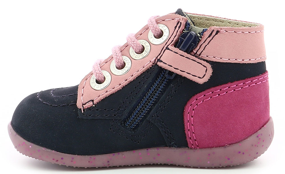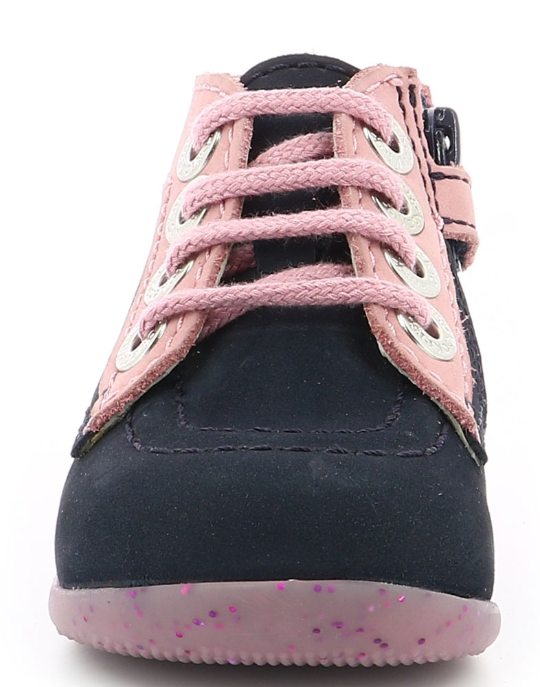 Δερμάτινα μποτάκια σε μπλε σκούρο χρώμα, διακοσμημένα με ροζ και φούξια λεπτομέρειες καθώς και με διακριτικά εξώραφα. Ευκολοφόρετα παπούτσια για απεριόριστους συνδυασμούς!