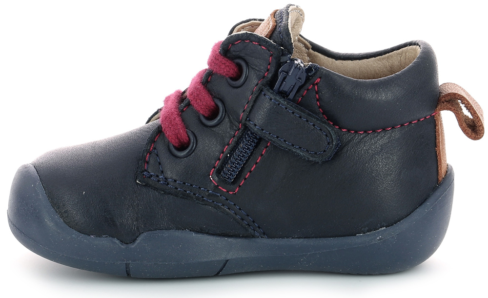 Δερμάτινα μποτάκια σε μπλε σκούρο χρώμα, διακοσμημένα με καμέλ λεπτομέρειες, εξώραφα και κορδόνια σε κόκκινο χρώμα. Ευκολοφόρετα παπούτσια για απεριόριστους συνδυασμούς.