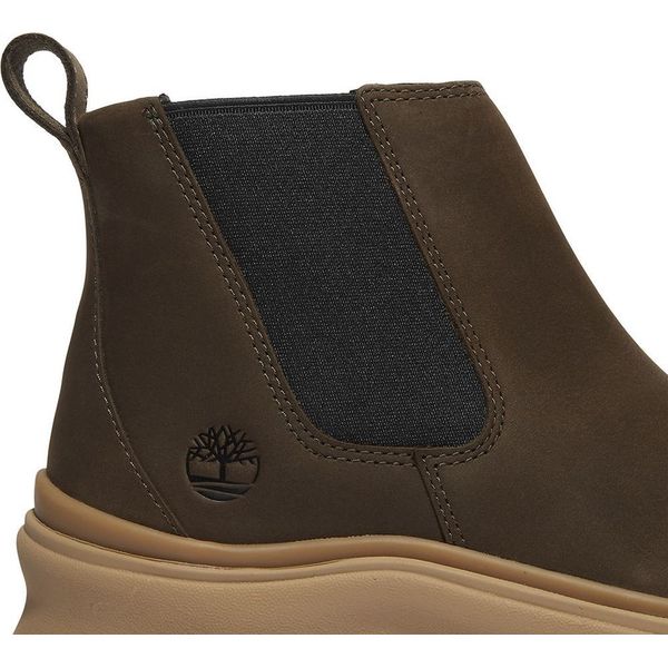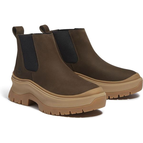 Timberland σε σκούρο καφέ χρώμα με μπεζ λεπτομέρειες.