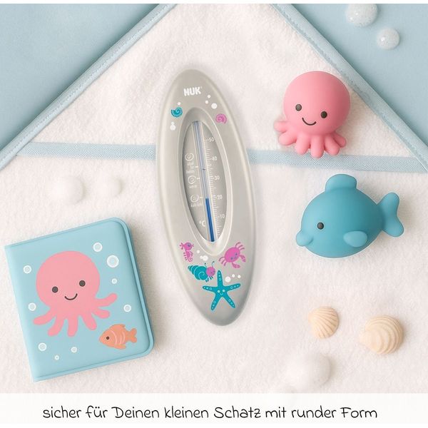 Το θερμόμετρο μπάνιου Ocean σε γκρι χρώμα από την NUK είναι ένας εξαιρετικός βοηθός κατά την προετοιμασία του μπάνιου του μωρού. Το υγρό μέτρησης αποτελείται από φυσικό έλαιο ελαιοκράμβης και το θερμόμετρο έχει ευκρινή κλίμακα έως και 50° C. Αυτό εγγυάται βέλτιστη ακρίβεια μέτρησης. Η πρακτική κλίμακα χρησιμοποιεί χαμόγελα για να υποδεικνύει εάν το παιδί σας αισθάνεται άνετα στο νερό του μπάνιου και εάν διατηρείται η βέλτιστη θερμοκρασία των 37° C. Το θερμόμετρο μπάνιου Ocean είναι στιβαρό, άθραυστο και διακοσμημένο με διασκεδαστικά θαλασσινά μοτίβα.