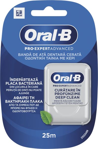 Οδοντική ταινία Oral-B Pro-Expert Advanced για καθαρισμό επαγγελματικού επιπέδου. Η ανάγλυφη οδοντική ταινία προσφέρει βαθύ καθαρισμό με φρέσκια γεύση μέντας. Καθαρίζει λεπτομερώς ανάμεσα στα δόντια, αφαιρώντας την πλάκα και τα σωματίδια τροφίμων.