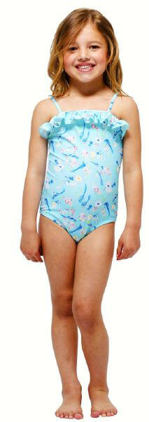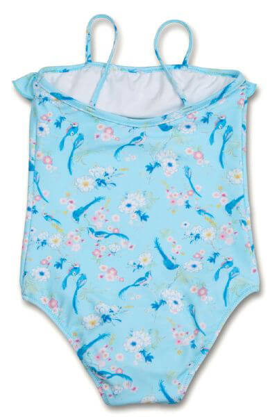 Διαθέτει διασκεδαστικό χαρακτηριστικό εκτύπωσης "Πουλιά Του Παραδείσου" και λεπτομέρειες "Λουλουδάκια" σχέδιο σε ροζ και λευκό χρώμα. Στη κορυφή διαθέτει ένα χαριτωμένο βολάν στο ίδιο σχέδιο. Διαθέτει επίσης ελαστικές τιράντες, οι οποίες προσαρμόζονται με το σωμα του παιδιού.
