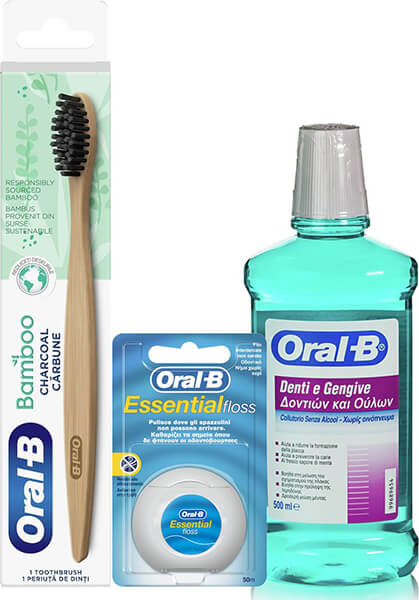 Το Σετ περιλαμβάνει 1 ORAL-B BAMBOO, 1 Στοματικό Διάλυμα και 1 Οδοντικό Νήμα. Η οδοντόβουρτσα Oral-B Bamboo Charcoal διαθέτει λαβή από 100% βιολογικό μπαμπού βιώσιμης προέλευσης από Ινδούς αγρότες και ίνες advanced wavy φυτικής προέλευσης εμποτισμένες με άνθρακα, κατασκευασμένες κατά 60% από καστορέλαιο. Το στοματικό Διάλυμα Oral-B Δοντιών και Ούλων χωρίς οινόπνευμά βοηθά στην πρόληψη της τερηδόνας και στη μείωση του σχηματισμού της πλάκας αφήνοντας σας μια δροσερή γεύση Μέντας. Τέλος το οδοντικό νήμα Oral-B Essential Floss καθαρίζει εκεί που δεν φτάνει η οδοντόβουρτσά σας. Συνδυάζει ειδικά σχεδιασμένες ίνες με επικάλυψη πολυμερούς που διευκολύνουν την απομάκρυνση της πλάκας.