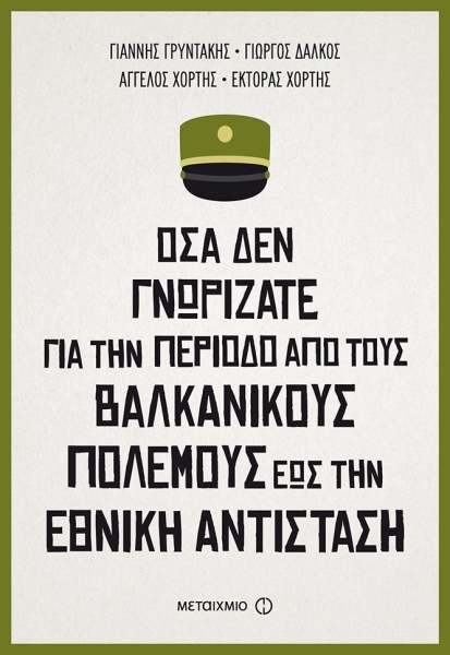 ISBN: 978-618-03-1822-7 Συγγραφέας: ΓΡΥΝΤΑΚΗΣ ΓΙΑΝΝΗΣ, ΔΑΛΚΟΣ ΓΙΩΡΓΟΣ, ΧΟΡΤΗΣ ΑΓΓΕΛΟΣ, ΧΟΡΤΗΣ ΕΚΤΟΡΑΣ Εκδοτικός οίκος: ΜΕΤΑΙΧΜΙΟ Σειρά: ΟΣΑ ΔΕΝ ΓΝΩΡΙΖΑΤΕ ΓΙΑ ΤΗΝ ΕΛΛΗΝΙΚΗ ΙΣΤΟΡΙΑ Σελίδες: 352 Διαστάσεις: 14Χ20,5 Ημερομηνία Έκδοσης: Φεβρουάριος 2019 Η ιστορία της Ελλάδας κατά το πρώτο μισό του 20ού αιώνα μέσα από ιστορικά «ανέκδοτα» δηλαδή κείμενα που μας μεταφέρουν στην ατμόσφαιρα της εποχής με έναν διαφορετικό τρόπο. Τα κείμενα αυτά βρίθουν από «ασήμαντες» λεπτομέρειες. ’λλες έχουν ενδιαφέρον ιστορικό, γιατί φωτίζουν τα ιστορικά γεγονότα, άλλες πάλι μας ξαφνιάζουν για την παραδοξότητά τους, άλλες ανατρέπουν την «επίσημη» άποψη για μεγάλες προσωπικότητες ή απλώς προκαλούν θυμηδία. Εστιάζοντας σε τέτοιου είδους λεπτομέρειες, προσεγγίζουμε την Ιστορία μέσα από ένα διαφορετικό κάτοπτρο, που προβάλλει το άγνωστο, το περίεργο, το «ασήμαντο» που πολλές φορές είναι ιδιαίτερα ενδιαφέρον. Ίσως αυτός να είναι ο μοναδικός τρόπος να μάθουμε κάποιες «αλήθειες» που εκούσια ή ακούσια η ιστορική έρευνα αντιπαρέρχεται ή αποσιωπά. Τα αποσπάσματα συνοδεύονται από τις ανάλογες παραπομπές στις πηγές ώστε ο αναγνώστης να μπορεί να ανατρέχει στο κατάλληλο κείμενο, για περισσότερη πληροφόρηση. Το περιεχόμενο του βιβλίου χωρίζεται σε τέσσερις βασικές ενότητες: -Τις πολεμικές επιχειρήσεις της περιόδου 1910-1945, καθώς και άλλα γεγονότα που συνδέονται με αυτές έμμεσα ή άμεσα (π.χ. ο εθνικός διχασμός, η δίκη των έξι κ.λπ.). -Τα στρατιωτικά κινήματα-επαναστάσεις που έγιναν την ίδια περίοδο. -Τη δράση των πρωταγωνιστών στις πολιτικές εξελίξεις της περιόδου, αλλά και άλλων προσωπικοτήτων της πολιτικής και κοινωνικής ζωής. -Την καθημερινή ζωή.