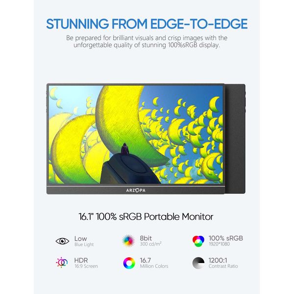 Η Arzopa Z1C 16,1" Z1Cείναι η ιδανική φορητή οθόνη για εργασία, ψυχαγωγία και gaming. Η μεγαλύτερη οθόνη 16,1" σε συνδυασμό με Full HD 1080P σε IPS panel με 100% sRGB χρώματα και 178° γωνία θέασης, εξασφαλίζει καθαρή, ζωντανή και ρεαλιστική εικόνα από κάθε γωνία.