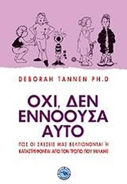 ISBN: 978-960-536-338-3 Συγγραφέας: ΤΑΝΝΕΝ ΝΤΕΜΠΟΡΑ Εκδοτικός οίκος: ΕΝΑΛΙΟΣ Σελίδες: 210 Διαστάσεις: 21x14 Ημερομηνία Έκδοσης: Μάρτιος 2008 ΠΩΣ ΟΙ ΣΧΕΣΕΙΣ ΜΑΣ ΒΕΛΤΙΩΝΟΝΤΑΙ Η ΚΑΤΑΣΤΡΕΦΟΝΤΑΙ ΑΠΟ ΤΟΝ ΤΡΟΠΟ ΠΟΥ ΜΙΛΑΜΕ Συχνά δεν μετράει τι λέμε, αλλά ο τρόπος με τον οποίον το λέμε. Η επιτυχία ή η αποτυχία κάθε σχέσης - στο σπίτι, στη δουλειά ή ακόμη και σε ένα ραντεβού -εξαρτάται από τα συνομιλητικά σήματα που εκπέμπουμε, όπως ο τόνος της φωνής μας, η χροιά και ο κυματισμός της, ο ρυθμός της, ο συντονισμός της, καθώς και οι απλές εναλλαγές των φράσεών που λέγονται. Η Ντέμπορα Τάννεν, διεθνώς αναγνωρισμένη ειδικός της επικοινωνίας, θα σας βοηθήσει να αναγνωρίσετε το προσωπικό σας συνομιλητικό στυλ, και να αντιληφθείτε κατά πόσον ταιριάζει ή συγκρούεται με το στυλ όλων όσοι σας περιβάλλουν. Τα διασκεδαστικά, βγαλμένα από τη ζωή, παραδείγματά της, θα σας διδάξουν πώς να ακούτε όσα δεν ειπώθηκαν, πώς να λύνετε τη σιωπή των άλλων, πώς να σταματάτε μια «συνομιλητική μπουλντόζα» που απειλεί να γκρεμίσει το δικαίωμα της συμμετοχής σας στη συζήτηση, πώς να προλάβετε την πυροδότηση μεγάλων παρεξηγήσεων από την ύπαρξη ασήμαντων διαφορών, και τέλος, πώς να προσαρμόσετε το ρυθμό ή τις φράσεις σας, για να σώσετε μια συνομιλία ή μια σχέση. «Είμαστε όλοι ξένοι μεταξύ μας: συντάκτες και συγγραφείς, άνδρες και γυναίκες, Καλιφορνέζοι και Νεοϋορκέζοι, φίλοι και φίλες. Η Ντέμπορα Τάννεν μας δείχνει πόσο διαφορετικοί είμαστε, και πώς θα καταφέρουμε να μιλήσουμε την ίδια γλώσσα.».