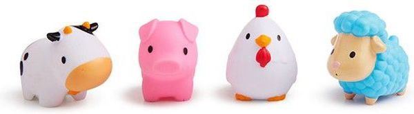 Περιλαμβάνονται 4 ζωάκια που πιτσιλίζουν και επιπλέουν (αγελάδα, πρόβατο, κότα και γουρούνι).