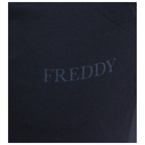 H εφαρμογή του είναι στενή και η ποιότητα του υφάσματος εξαιρετική. Το παντελόνι έχει slim γραμμή και μπλε χρώμα. Μπροστά υπάρχουν δύο λοξές τσέπες και πίσω δύο οριζόντιες τσέπες διακοσμητικές. Στην μέση υπάρχει λάστιχο και σατέν κορδόνια μπλε χρώματος. Επίσης στην αριστερή πλευρά, στο μπροστινό μέρος υπάρχει το brand "Freddy" γραμμένο με ασημόσκονη ραφ χρώματος.