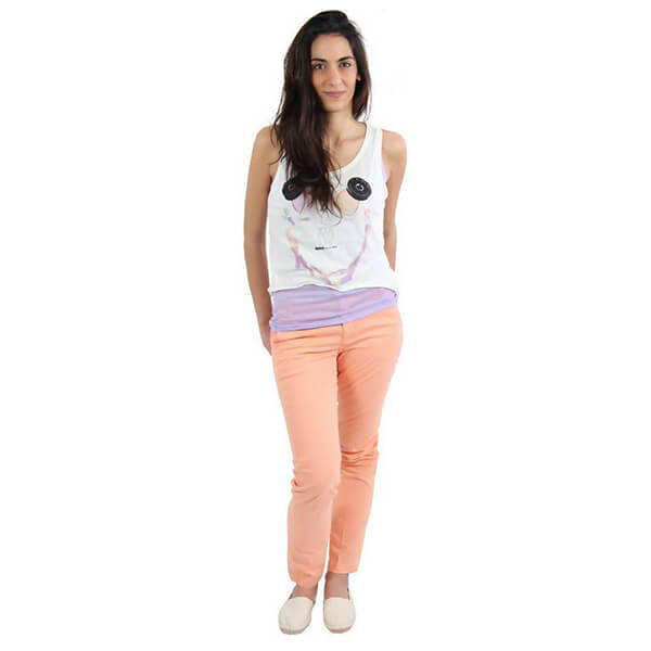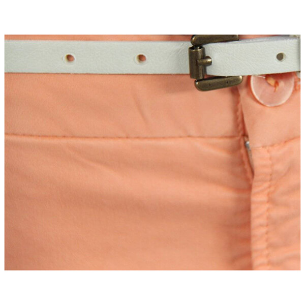 Το χρώμα του είναι ροδακινί. Έχει κανονικό καβάλο, δυο πλαινές τσέπες και δυο πίσω διακοσμητικές, θηλιές για ζώνη και κουμπώνει με φερμουάρ.