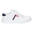 Κατασκευασμένα εξωτερικά και εσωτερικά από συνθετικό ύφασμα.Διαθέτουν αντιολισθητική σόλα από καουτσκούκ.Κλείνουν με διπλό velcro (σκρατς).Σε χρώμα λευκό με σκούρες πλε και κόκκινες λεπτομέρειες. Διακοσμημένα με υφασμάτινο patch στην εξωτερική πλευρά και στη γλώσσα, ενώ στην πίσω πλευρά στη σόλα υπάρχει ανάγλυφο το logo της Levi's.