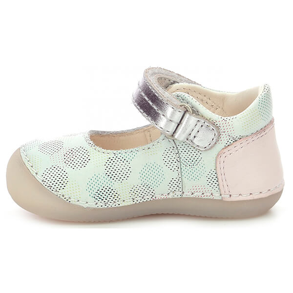 Kickers σε λευκό χρώμα, διακοσμημένα με ροζ και ασημί λεπτομέρειες, πουά μοτίβο και τρισδιάστατες στρογγυλές λεπτομέρειες στο λουράκι.