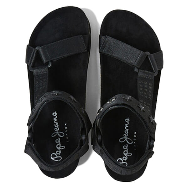 Πέδιλα με την υπογραφή της Pepe Jeans, με σχέδιο το logo της εταιρείας, σε μαύρο χρώμα με μεταλλικές λεπτομέρειες.
