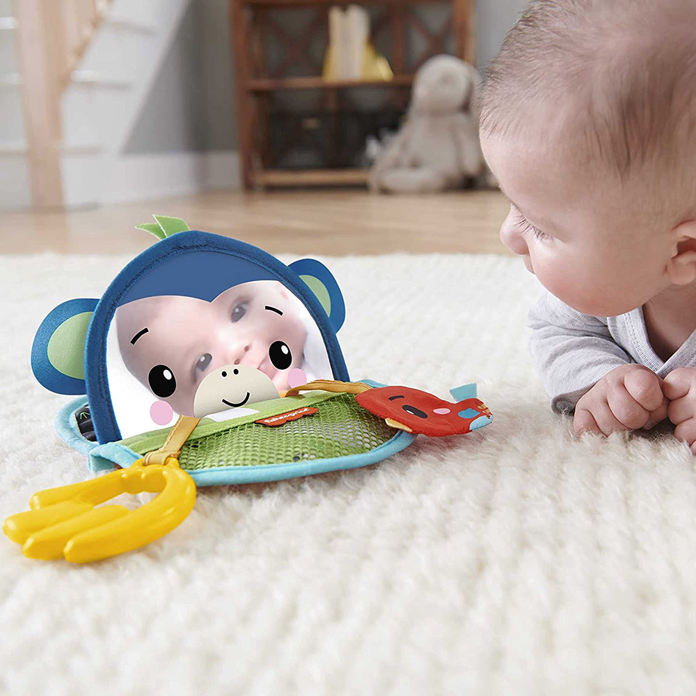 • Φορητός καθρέφτης-μαϊμουδάκι με μαλακά αυτιά, 2 πλευρές παιχνιδιού και 3 παιχνίδια, όπως μπανάνες και πουλάκι.