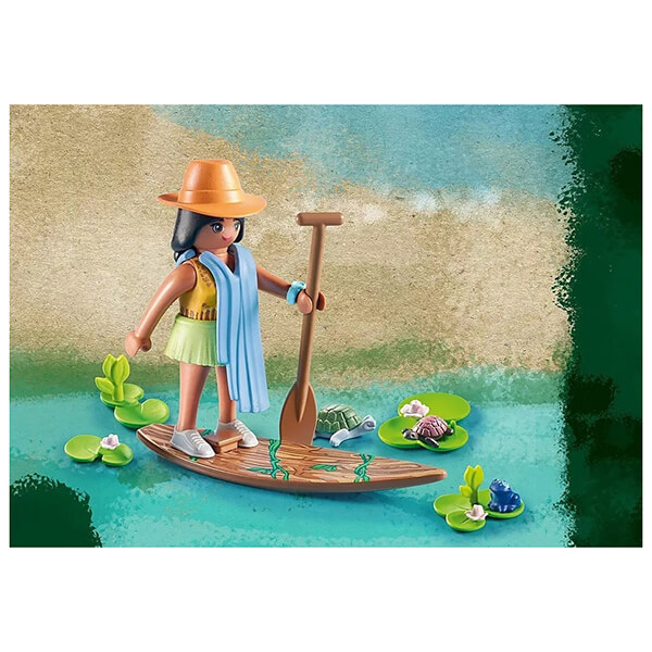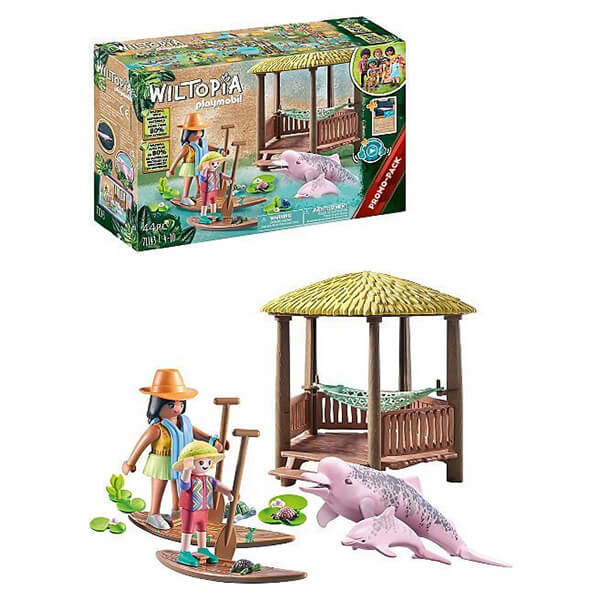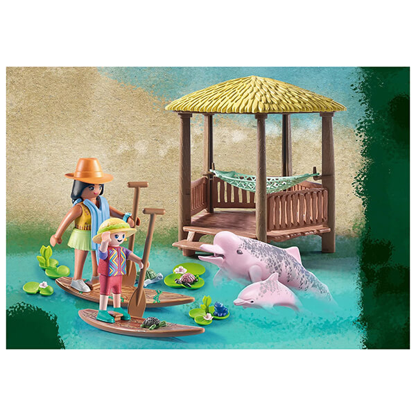 Κατά τη διάρκεια του ταξιδιού της στον Αμαζόνιο, μία από τις αγαπημένες δραστηριότητες της Sofia Palmer ήταν να ανακαλύψει την χλωρίδα και την πανίδα του τροπικού δάσους. Μαζί με την κόρη της Liv, κάνουν SUP για να καταφέρουν να δουν από κοντά τα ροζ δελφίνια. Όμως, πάντα φροντίζουν να κρατούν αποστάσεις ασφαλείας για να μην τα τρομάξουν. Το σετ περιλαμβάνει δύο φιγούρες Playmobil, ένα ροζ δελφίνι με το μικρό του, μία χελώνα με τα μικρά της, δύο σανίδες του SUP με κουπιά και απίθανα αξεσουάρ για περισσότερη διασκέδαση.