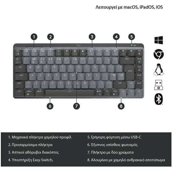 Μηχανική πληκτρολόγηση σε μίνιμαλ σχεδίαση Απολαύστε την απόλυτη αίσθηση μηχανικής πληκτρολόγησης με το MX Mechanical Mini. Αυτό το πληκτρολόγιο προσφέρει ταχύτητα και ακρίβεια σε μία μίνιμαλ μορφή, βελτιώνοντας τη στάση του σώματος και την άνεσή σας, χωρίς να θυσιάζει την απόδοση. Έξυπνος φωτισμός για απόδοση χωρίς περισπασμούς Ο οπίσθιος φωτισμός των πλήκτρων ενεργοποιείται αυτόματα όταν πλησιάζουν τα χέρια σας, προσαρμόζοντας την ένταση ανάλογα με το φωτισμό του χώρου, βελτιστοποιώντας τη χρήση μπαταρίας. Μπορείτε να επιλέξετε από διάφορα καθηλωτικά εφέ φωτισμού για βέλτιστη συγκέντρωση. Προσαρμογή του MX Mechanical Mini με το Logi Options+ Εξατομικεύστε τη χρήση του πληκτρολογίου με το Logi Options+, αλλάζοντας λειτουργίες πλήκτρων, ελέγχοντας τη διάρκεια ζωής της μπαταρίας, και επιλέγοντας εφέ φωτισμού. Εργαστείτε ομαλά μεταξύ πολλαπλών συσκευών Mac χάρη στην τεχνολογία Flow. Πολλαπλή σύνδεση με ευκολία Συνδέστε το MX Mechanical Mini με το MacBook, το iMac, και το iPad μέσω Bluetooth και αλλάζετε συσκευές με το πάτημα ενός κουμπιού. Υποστηρίζει σύνδεση με έως και τρεις συσκευές ταυτόχρονα. Γρήγορη φόρτιση και μακροχρόνια αυτονομία Παραμένει λειτουργικό για έως και 15 ημέρες με πλήρη φόρτιση ή έως και 10 μήνες αν ο οπίσθιος φωτισμός είναι απενεργοποιημένος. Μια μόνο γρήγορη φόρτιση 15 λεπτών προσφέρει πλήρη ημερήσια απόδοση. o Πλήκτρα Easy-Switch για εναλλαγή μεταξύ συσκευών. o Φόρτιση με USB-C. Εμβέλεια ασύρματης σύνδεσης: 10 m. o Ενδεικτικές λυχνίες για το Caps Lock και την μπαταρία. Χαρακτηριστικά: Ύψος: 131,55 mm, Πλάτος: 312,60 mm, Βάθος:26,10 mm. Βάρος: 612 g. Χρώμα: Ανοιχτό γκρι. Εγγύηση: 2 χρόνια. DOA 7 ημερών