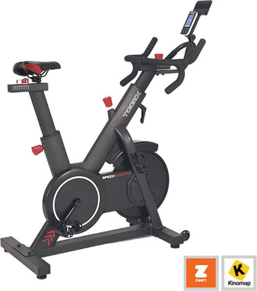 Ποδήλατο Spin Bike SRX Speed Mag HRC TOORX. Είναι συμβατό με τις εφαρμογές Zwift App και Kinomap App (απαιτείται συνδρομή). • Μετάδοση κίνηση:ς μέσω δίσκου με επιμήκη ιμάντα. • Σύστημα αντίστασης: Mαγνητικό ελεγχόμενο από ηλεκτρικό μοτέρ 24 επιπέδων. • Bάρος τροχού: 20 kg. • Μέγιστο βάρος χρήστη: 125 kg. • Θέση σέλας: Δίχρωμη σέλα με κάθετη και μικρομετρική οριζόντια ρύθμιση. • Τιμόνι: Κάθετη και μικρομετρική οριζόντια ρύθμιση. • Yψος τιμονιού (από την πάνω άκρη του τιμονιού έως την βάση στήριξης): min 94, 5 cm - max 100, 5 cm. • Yψος σέλας: min 73 cm - max 51, 5 cm. • Απόσταση τιμονιού / σέλας: min 43 cm - max 51, 5 cm. • Μανιβέλα πεντάλ: 3 κομμάτια. • Q Factor: σύνολο 19, 0 cm | αριστερό 9, 5 cm - δεξί 9, 5 cm. • Βάρος: 43 kg. • Ροδάκια μεταφοράς: Ναι. • Διαστάσεις όταν στηθεί: 116 x 51 x 132 cm. • Πιστοποιήσεις: CE-ROHS-EN957. • Κονσόλα: Οθόνη LCD με μπλε φωτισμό, βάση για tablet/smartphone. • Ενδείξεις: Απόσταση, χρόνος, θερμίδες, παλμοί, ταχύτητα, RPM, επίπεδο έντασης. • Προγράμματα: 1 manual, 10 προκαθορισμένα προγράμματα, 4 HRC, Watt, User • Μέτρηση καρδιακού παλμού: Ενσωματωμένος ασύρματος δέκτης καρδιακών παλμών. Περιλαμβάνεται ζώνη μέτρησης καρδιακών παλμών. • App Ready 3.0: Ενσωματωμένο έξυπνο σύστημα Bluetooth που επιτρέπει τη σύνδεση του ποδήλατού σας με τις πιο ελκυστικές εφαρμογές που είναι ειδικά σχεδιασμένες για προπόνηση σε ποδήλατα. • Εγγύηση: 2 χρόνια. DOA 7 ημερών