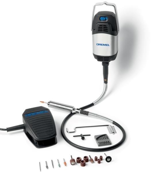 Υψηλής ισχύος κινητήρας 300 W για ιδανική απόδοση. Μεταβλητή ταχύτητα 0 / 20.000 στροφές ανά λεπτό για καλύτερο έλεγχο. Υψηλή ροπή σε χαμηλές ταχύτητές, για εργασίες ακριβείας, που απαιτούν μεγάλη ισχύ με χαμηλό αριθμό στροφών. Το πεντάλ ποδιού επιτρέπει τον έλεγχο της ταχύτητας με "ελεύθερα χέρια". Στιβαρός μεγάλης διάρκειας ζωής εύκαμπτος άξονας, με πατενταρισμένο σύστημα, για μείωση της θερμότητας περιστροφής και για την αύξηση του χρόνου ζωής. Αντικαθιστούμενη χειρολαβή ακριβείας μέσω συστήματος 'κλικ'. Εύκολη αλλαγή των εξαρτημάτων μέσω τσοκ. Τέλεια ακρίβεια μέσω φωλιάς χαμηλής εκκεντρότητας. Μεταβλητή διάμετρος στελέχους (0, 3 / 4, 0 mm), κατάλληλο για όλα τα εξαρτήματα Dremel υψηλής ποιότητας.
