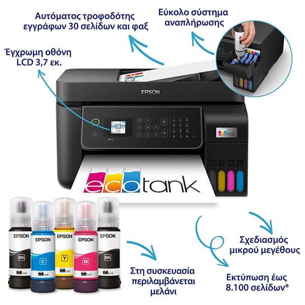 Οι εκτυπωτές EcoTank παρέχουν οικιακές εκτυπώσεις χωρίς ταλαιπωρία: Χάρη στην εξαιρετικά υψηλή χωρητικότητα τους, τα δοχεία μελανιών επιτρέπουν την εύκολη αναπλήρωση, ενώ τα φιαλίδια διαθέτουν σχεδιασμό κλειδώματος, έτσι ώστε να μπορεί να τοποθετηθεί μόνο το σωστό χρώμα. Χάρη στην μπροστινή οθόνη στάθμης μελανιού, είναι εύκολο να βλέπετε πότε απαιτείται αναπλήρωση.