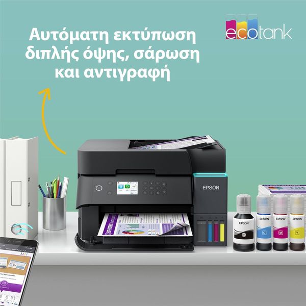 Ο EcoTank L6370 προσφέρει εκτύπωση, αντιγραφή και σάρωση διπλής όψης μέσω αυτόματης τροφοδοσίας εγγράφων (ADF), αυξάνοντας σημαντικά την αποδοτικότητα και εξοικονομώντας χρόνο σε επαγγελματικά περιβάλλοντα.