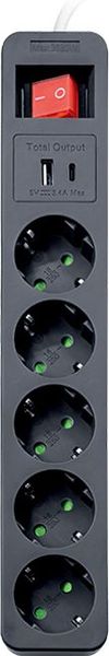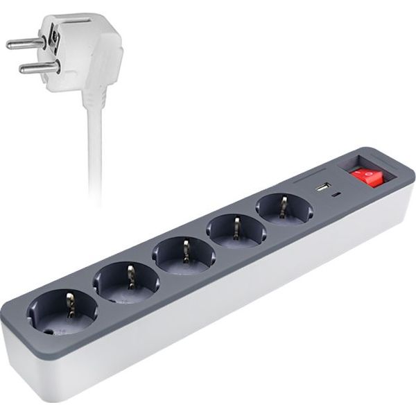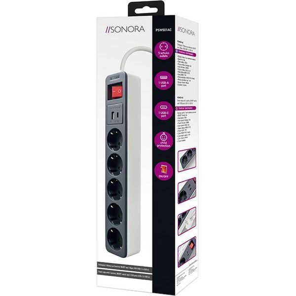 Πολύπριζο 5 θέσεων με διακόπτη ON/OFF και 2 θύρες USB (USB-C & USB-Α). Το πολύπριζο SONORA διαθέτει 5 υποδοχές τύπου σούκο για να συνδέσεις έως και 5 ηλεκτρικές συσκευές ταυτόχρονα. Οι υποδοχές σούκο είναι εξοπλισμένες με ασφάλεια για τα παιδιά, ενώ διαθέτει και διακόπτη ON/OFF για να απενεργοποιείτε το πολύπριζο όταν δεν το χρησιμοποιείτε.