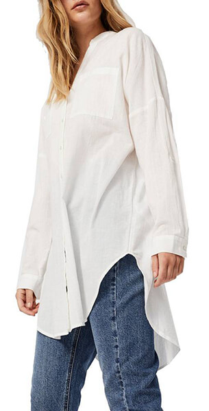 Μονόχρωμη, μακρυά πουκαμίσα με loose, άνετη γραμμή και μακριά μανίκια.