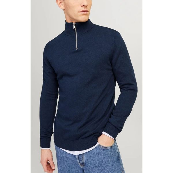 Πρόκειται για ένα μονόχρωμο λεπτό πουλόβερ με κανονική εφαρμογή και υπερυψωμένο γιακά που κλείνει με φερμουάρ.
