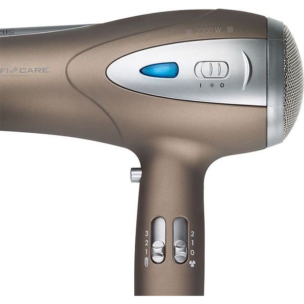 Σεσουάρ μαλλιών 2200W με λειτουργία ιονισμού, σε καφέ χρώμα.